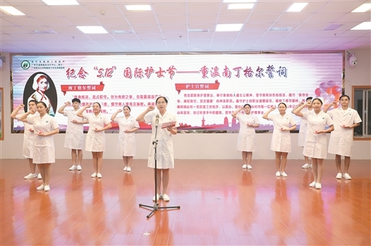 追随习近平总书记在广西视察时的足迹,组织医院护理团队到桂林开展主题党日活动,评选年度优质护理服务先进,开展新型冠状病毒肺炎护理知识竞赛,举办“白衣天使心向党,玉兰诵读绽芬芳”主题朗诵会以及读书会沙龙……南宁市第四人民医院开展系列活动迎接护士节,弘扬南丁格尔精神,传承护理文化,强化专业技能,在新时代、新征程中提高护理质量,用饱满的热情与积极的态度继续投入到疫情防控常态化与日常诊疗护理工作中。图为5月11日,护理部主任带领新入职护士宣誓。徐 静/摄