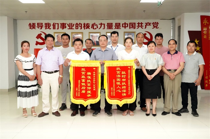 5月14日,在兴宾区人民医院上演了温情的一幕。兴宾区三五镇上李村党支部书记覃秀燕一行代表上李村“两委”以及全村村民群众,将印有“精准扶贫伸援手 脱贫致富做后盾”“驻村帮扶结深情 扶贫济困暖人心”的两面锦旗送到兴宾区人民医院院长覃鑫的手中。